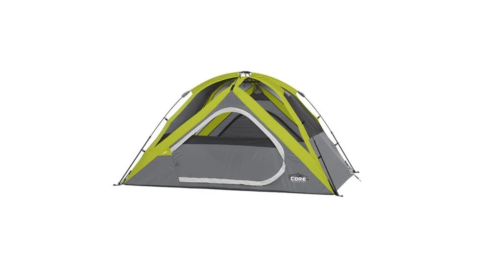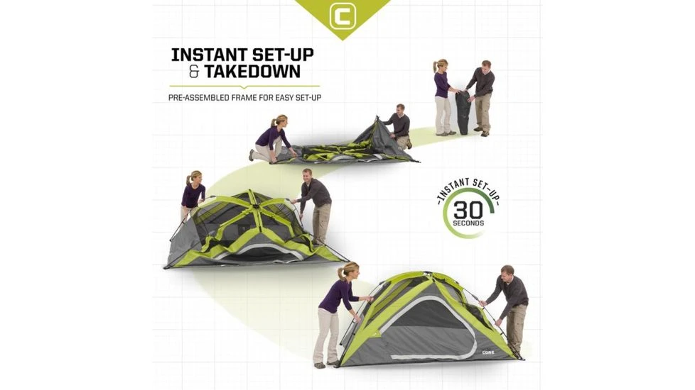 This four person instant dome tent features stress-free setup in 30 seconds! The poles are pre-attached to the tent- just unpack, unfold, and extend. Core H20 Block Technology combines water repellent fabrics with active bead technology for faster water runoff paired with sealed seams and rain-resistant door/window seals. Additionally, the fully-taped rainfly is removable in warmer weather to expose panoramic mesh windows and ceiling.![]()